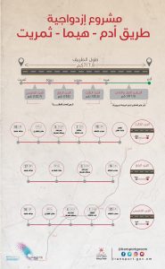 ويعد مشروع ازدواجية طريق ( أدم ـ هيماء ـ ثمريت ) البالغ طوله الإجمالي 717.5كم من المشاريع الاستراتيجية الكبرى التي تنفذها الحكومة ويُعد المشروع شريانا رئيساً وسريعاً يربط منابع النمو الاقتصادي والعمراني بين محافظات السلطنة ويسهم في استيعاب النمو المضطرد في حركة المرور ويدفع بقطاعات التنمية المختلفة بالسلطنة.
